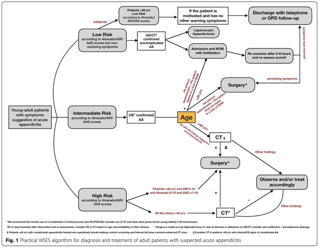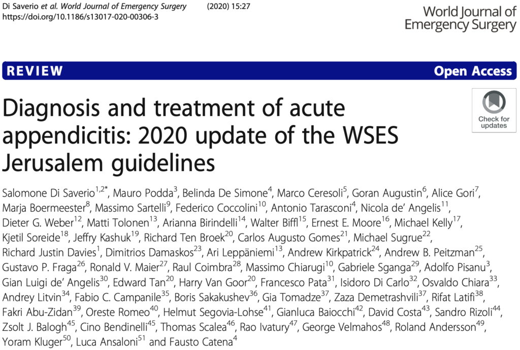 Di Saverio S, Podda M, De Simone B, Ceresoli M, Augustin G, Gori A, et al. Diagnosis and treatment of acute appendicitis: 2020 update of the WSES Jerusalem guidelines. World J Emerg Surg. World Journal of Emergency Surgery; 2020;15:27. https://wjes.biomedcentral.com/articles/10.1186/s13017-020-00306-3