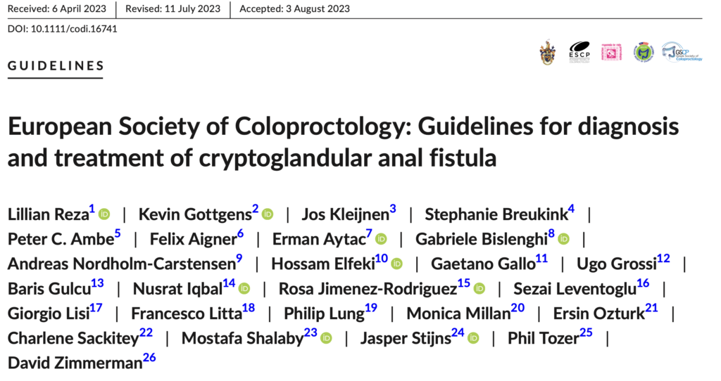 Reza L, Gottgens K, Kleijnen J, Breukink S, Ambe PC, Aigner F, et al. European Society of Coloproctology: Guidelines for diagnosis and treatment of cryptoglandular anal fistula. Color Dis 2023:1–52. doi:10.1111/codi.16741.