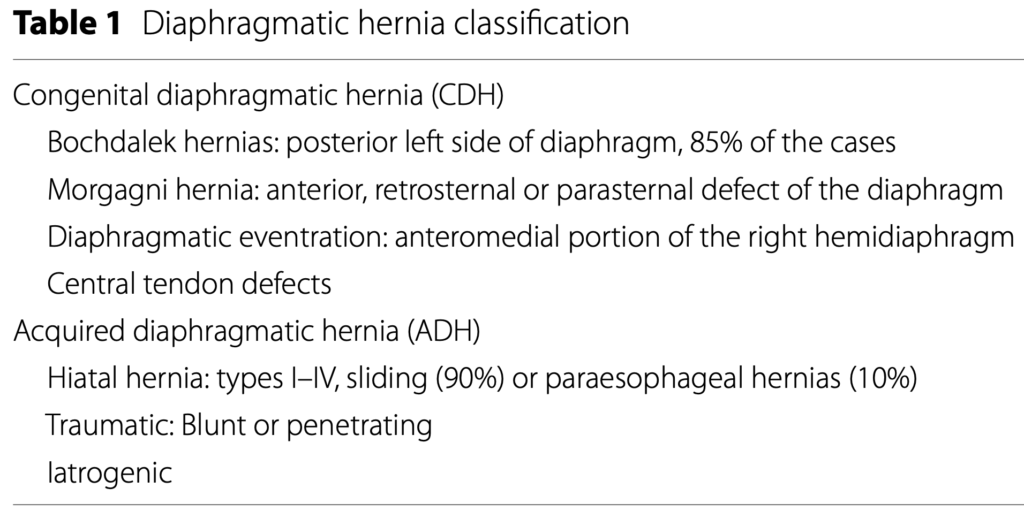 It was recommended not to perform primary closure of the diaphragm if the distance between the edge of the remaining part of the diaphragm and the chest wall is more than 3–4 cm. Primary diaphragmatic suture or mesh reconstruction can seal the chest cavity without paradoxical chest movement or increase in mortality. Many different materials can be used for the reconstruction, mostly favored by the surgeon’s experience, attitude and preference. The reconstruction is typically performed with synthetic meshes. They are well tolerated, can be bio-prosthetic materials or entirely artificial mesh, either absorbable or non-absorbable. Many reviews have evaluated the role of different meshes in DH repair. A mesh should be used for larger defects. Biological meshes have lower rate of hernia recurrence, higher resistance to infections and lower risk of displacement compared with synthetic meshes. An alternative to biological meshes for the repair, particularly of the clean-contaminated and contaminated diaphragmatic hernia repair, is an absorbable synthetic mesh. Absorbable synthetic mesh has the prospective advantages of reduced cost and minimal constraints in manufacturing alternative sizes. Because of