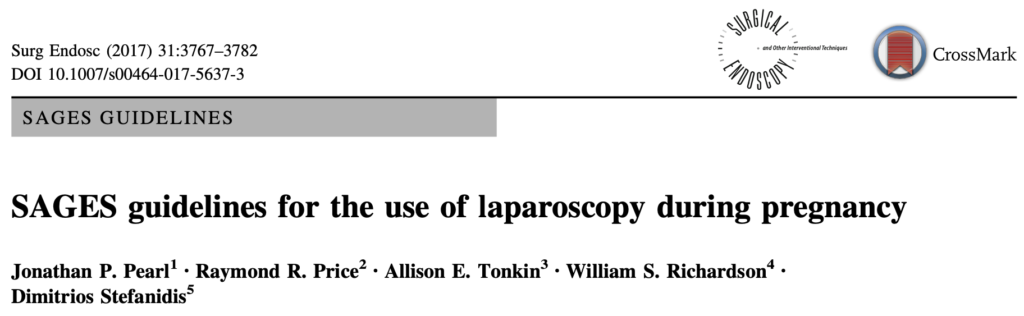 Pearl JP, Price RR, Tonkin AE, Richardson WS, Stefanidis D. SAGES guidelines for the use of laparoscopy during pregnancy. Surg Endosc. Springer US; 2017;31:3767–82.