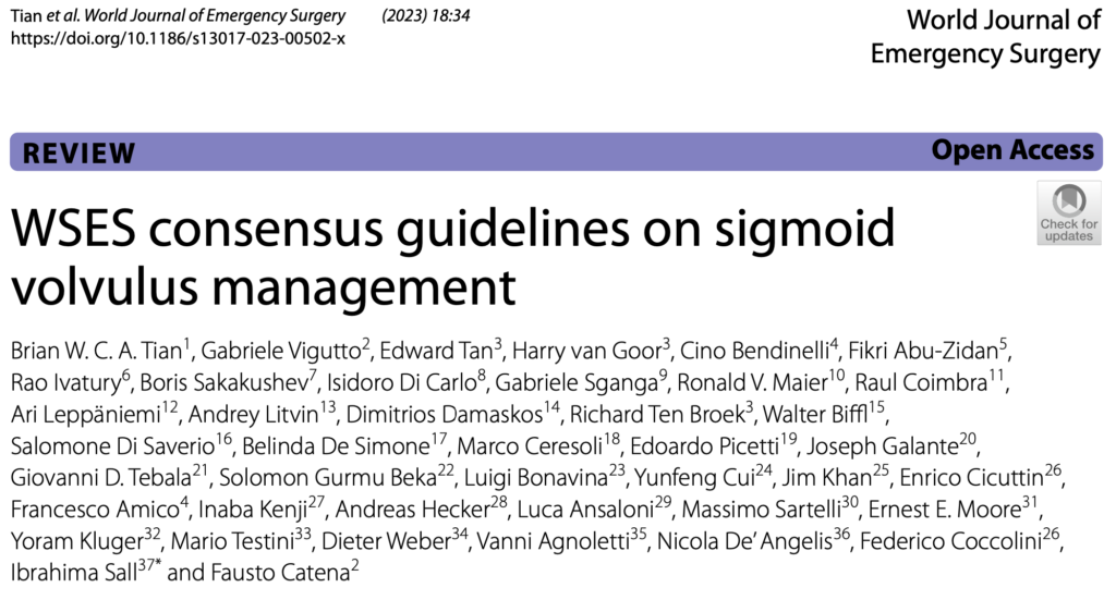 Tian BWCA, Vigutto G, Tan E, van Goor H, Bendinelli C, Abu-Zidan F, et al. WSES consensus guidelines on sigmoid volvulus management. World J Emerg Surg. BioMed Central; 2023;18:34. https://wjes.biomedcentral.com/articles/10.1186/s13017-023-00502-x